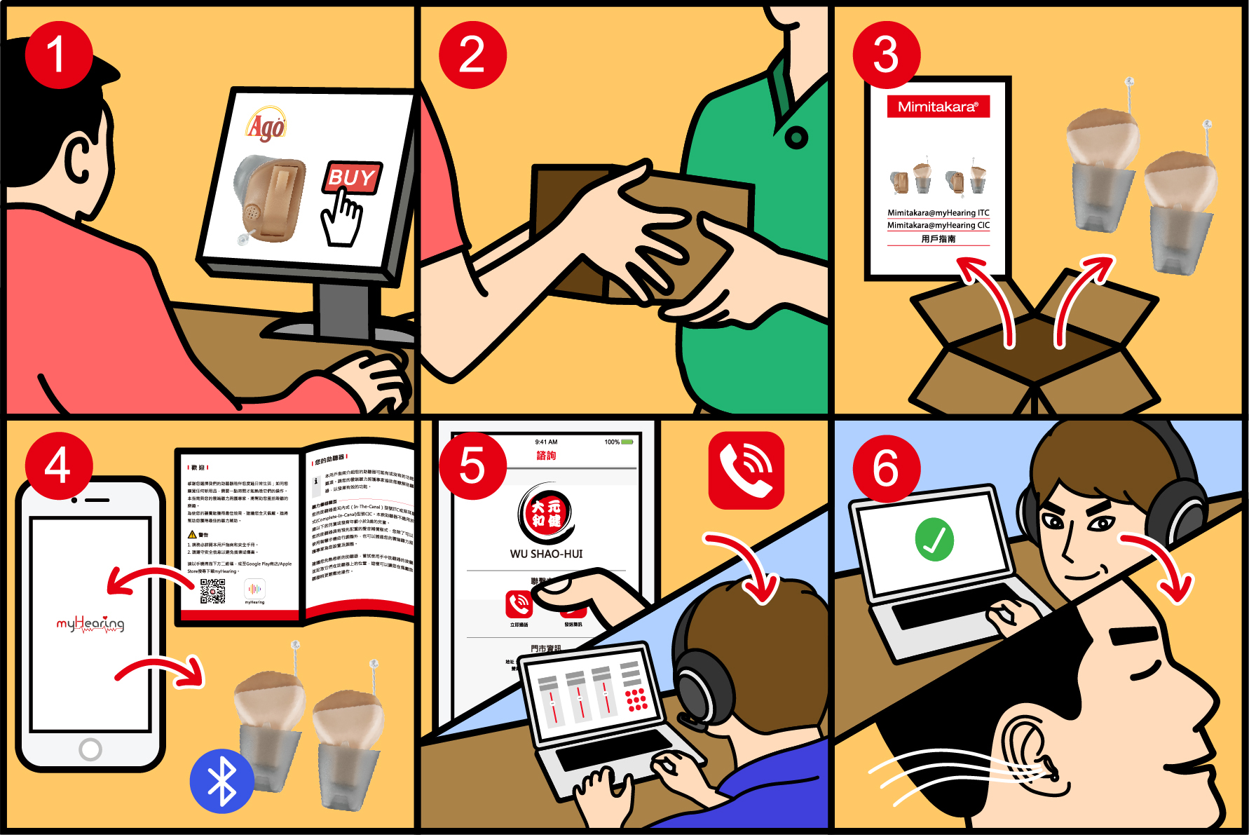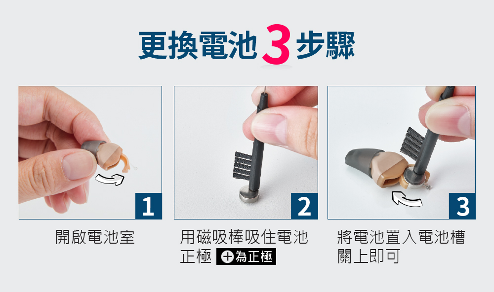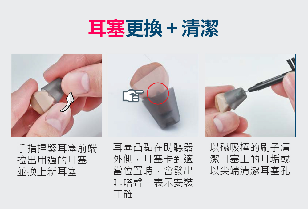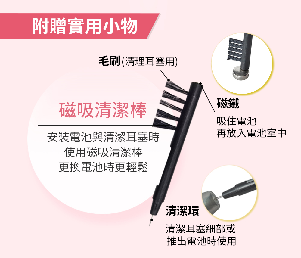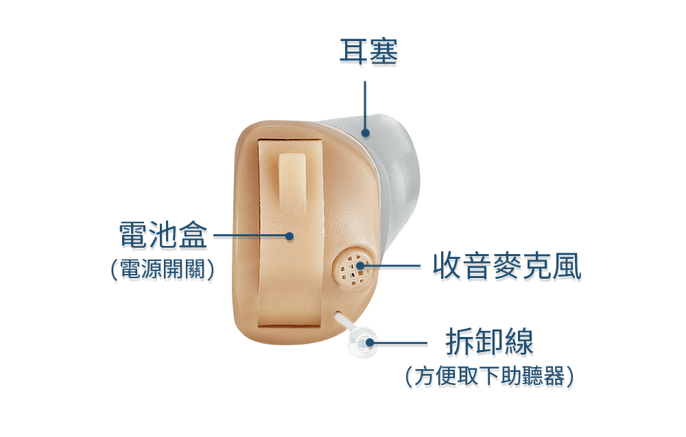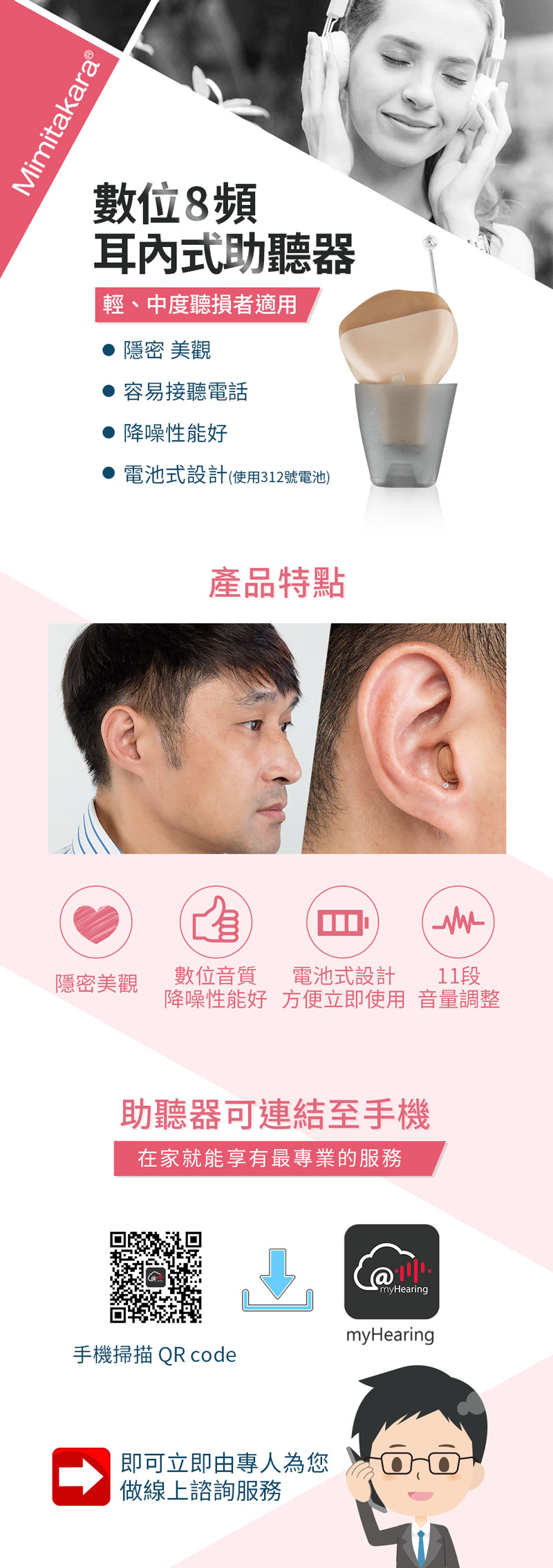 ● 產品配件: 數位8頻耳內型助聽器、耳塞 (大、小尺寸各一)、收納盒、快速使用指南、終生服務卡、電池、磁吸清潔棒