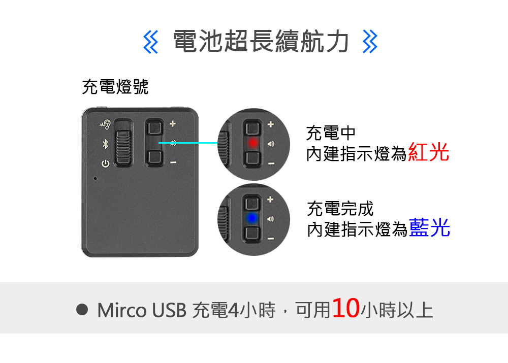 ● Micro USB充電,電池超強續航力,充電4小時,可用10小時以上。