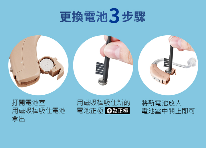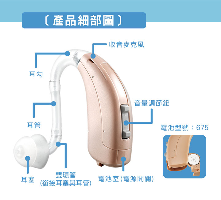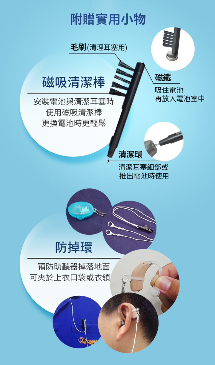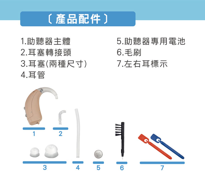 ● 產品配件: 數位8頻耳掛型助聽器、耳塞(兩種尺寸)、耳管、L管、終生服務卡、電池、磁吸清潔棒、標色棒