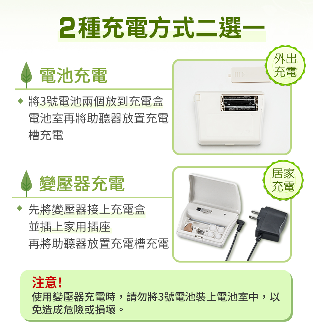● 充電式設計免用鋅空氣電池,節省、方便又環保。